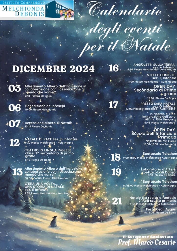 In vista del Santo Natale, l’Istituto Comprensivo “Melchionda -De Bonis” propone un calendario ricco di eventi, con gli immancabili Open Days del 16 e 17 Dicembre.